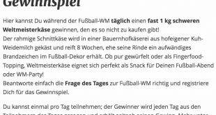 IchliebeKäse.de veranstaltet ein tolles Gewinnspiel und du kannst dabei täglich einen leckeren Weltmeister Käse abstauben. Die WM hat angefangen, die ersten Spiele sind schon gelaufen und alle sind gespannt wie es weitergeht. Täglich neue Spiele, täglich wieder die Chance, dass ein Favorit weiterkommt oder ein unerwarteter Sieger aus einem Duell hervorgeht. Und bei IchliebeKäse.de kannst du jetzt täglich mit ein bisschen Glück einen Weltmeister Käse gewinnen. Deshalb solltest du auf jeden Fall an dem Gewinnspiel teilnehmen und vielleicht gewinnst du ja einen tollen Preis. IchliebeKäse.de informiert dich auf ihrer …