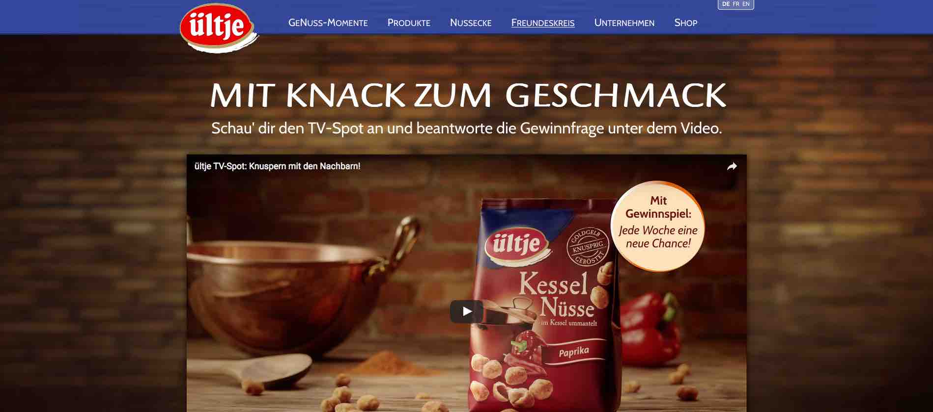 Jede Woche wird beim ültje Gewinnspiel ein Gewinner aus dem Lostopf gezogen. Um bei jeder Ziehung dabei zu sein, musst Du wöchentlich die jeweilige Gewinnspielfrage beantworten. Einen Hinweis auf die Lösung bietet dir dabei jeweils der aktuelle ültje TV-Spot. Das Video mit dem Werbespot kannst Du dir auf der verlinkten Gewininspielseite ansehen. Für die aktuelle Woche haben wir einen Lösungsvorschlag erarbeitet. Du findest ihn weiter unten.
